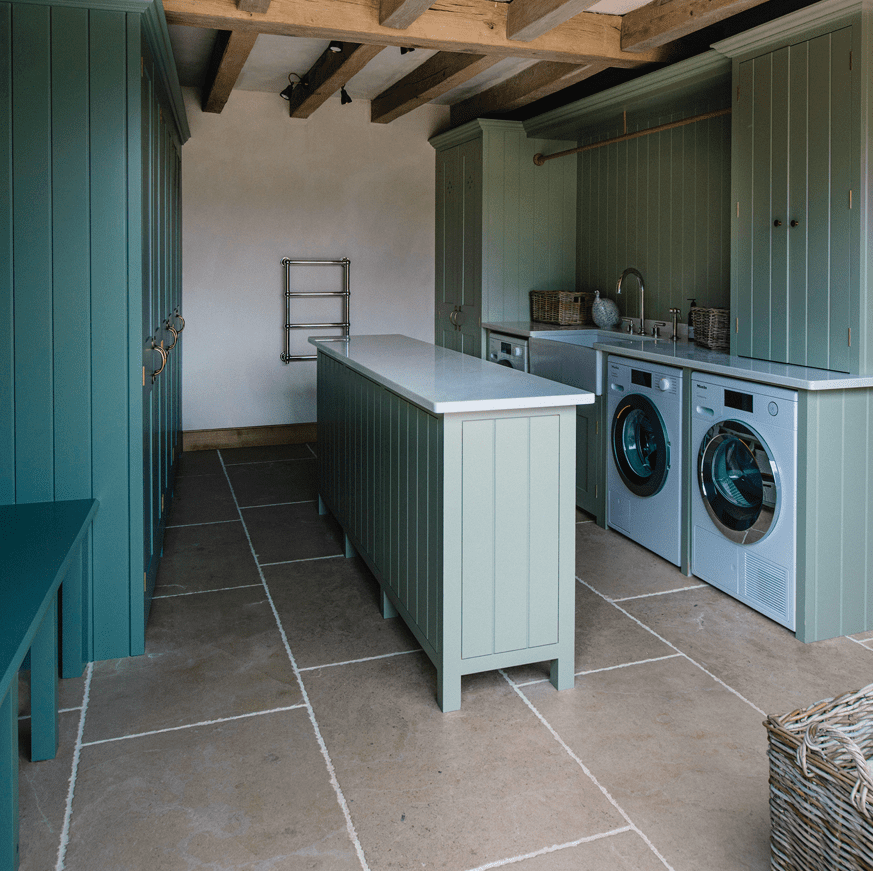 Designing with built-in and custom cabinetry within larger rooms provides maximum freedom and enables us to utilize the entire space in question. When designed, a laundry room can make the laundry process far more enjoyable and make for efficient use of time and space. For larger families and households, a set of washing machines and dryers can be beneficial. A spacious laundry room can double as storage with a bank of tall cupboards with slatted or painted shelves for folded bed linen, towels, and table linens.