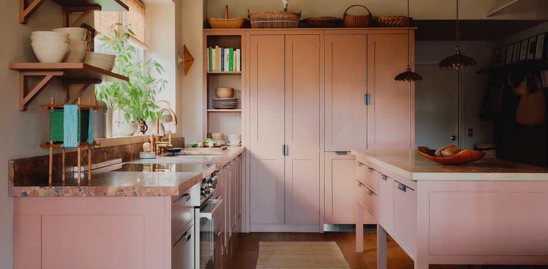 This context set, a streamlined run of Spitalfields cupboards and a reduced depth Worktable run parallel and join the kitchen to the living room. The individual elements of each room shepherd movement through the apartment, each tailored to accommodate the specific needs of the given space, whether open shelving, deep drawers, or appliance housings. Well-appointed wardrobe cupboards discreetly provide necessary storage space with no interruption to everyday living.
